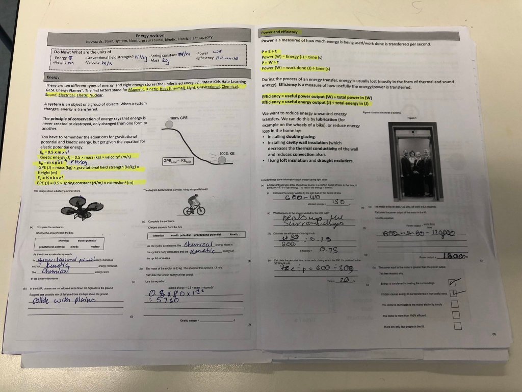 These resources I print 2-up on A3 paper and use either as a warm-up or shortly before an assessment/exam (shown in photo below). They consist of core notes (that don’t include everything but are a good start) as well as a related exam question.